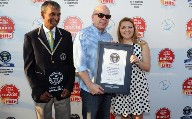 Την Κυριακή 22 Ιουνίου στο Πάρκο Παλαιού Φαλήρου, η αγαπημένη μας μάρκα Elite έστρωσε το μεγαλύτερο σε μήκος τραπέζι πικνίκ και κατέκτησε τον αντίστοιχο τίτλο του Παγκόσμιου Ρεκόρ Guinness. Στο τραπέζι που κατασκευάστηκε από ξύλο, σε ενιαία μορφή ειδικά για την περίσταση και έχει μήκος 120,33 μέτρα, κάθισαν 480 άτομα.