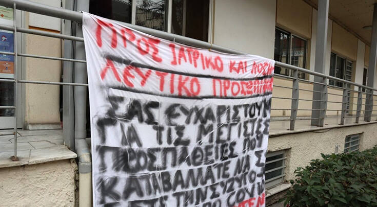 «Σας ευχαριστούμε για τις μέγιστες προσπάθειες που καταβάλατε να σώσετε την σύζυγο και μαμά από τον Covid. Καλά Χριστούγεννα» γράφει το πανό που κρέμεται τις τελευταίες ημέρες έξω από το νοσοκομείο της Λάρισας όπως φαίνεται σε φωτογραφία που δημοσίευσε το larissanet.gr και έχει τραβηχτεί από τον Λεωνίδα Τζέκα.