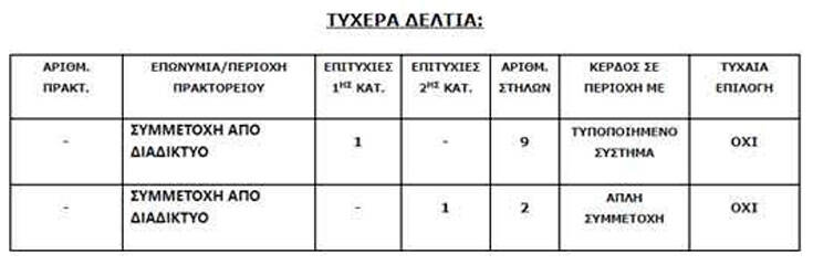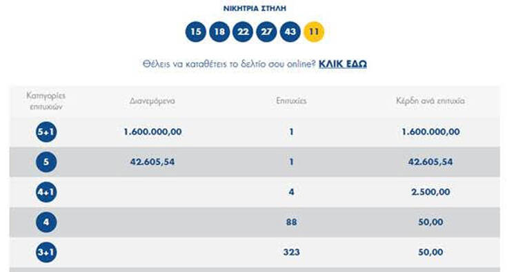 Το online δελτίο, που κέρδισε 1,6 εκατομμύρια ευρώ, περιείχε 9 στήλες και κόστισε 4,5 ευρώ. Οι αριθμοί ήταν επιλογής του ίδιου του παίκτη, που είχε επίσης την έμπνευση να επιλέξει ένα από τα τυποποιημένα συστήματα του ΤΖΟΚΕΡ. Οι τυχεροί αριθμοί που έβγαλε η κληρωτίδα το βράδυ της Τρίτης ήταν οι 15, 18, 22, 27, 43 και ΤΖΟΚΕΡ το 11.
