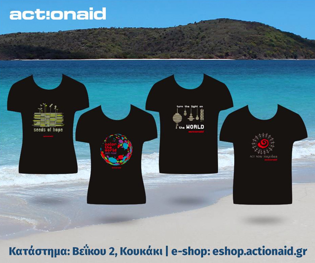 Ένα tribal σχέδιο με μήνυμα «Act together now», ένα πολύχρωμο «Colour the world – act now», ένα αφαιρετικό σχέδιο με «σπόρους ελπίδας» και πρωτότυπα «φώτα» που γεμίζουν με φως τον κόσμο είναι τα νέα σχέδια που σας περιμένουν στο νέο κατάστημα της ActionAid, που βρίσκεται στην οδό Βεΐκου 2 στο Κουκάκι καθώς και στο eshop.actionaid.gr. Ιδέες για ένα διαφορετικό δώρο που κάνει τον κόσμο μας λίγο καλύτερο, αφού με κάθε αγορά σας στηρίζετε την δράση της ActionAid.