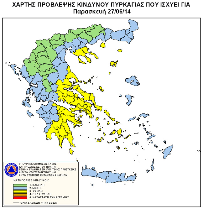 Υψηλός είναι σήμερα ο κίνδυνος πυρκαγιάς για τις περιοχές Ανατολικής Στερεάς Ελλάδος (συμπεριλαμβανομένης της Αττικής), Πελοποννήσου, Θεσσαλίας, Χαλκιδικής, Νήσων Βορείου Αιγαίου και Κυκλάδων σύμφωνα με το χάρτη κινδύνου που εξέδωσε η Γενική Γραμματεία Πολιτικής Προστασίας του υπουργείου Δημόσιας Τάξη.