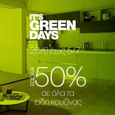 Από τις 26 Ιουνίου έως και τις 5 Ιουλίου τα GREEN DAYS προσφέρουν μοναδικές ευκαιρίες σε όλα τα είδη κουζίνας: έπιπλα κουζίνας, τραπεζαρίες, ηλεκτρικές συσκευές, μπαταρίες, νεροχύτες αλλά και ντουλάπες.