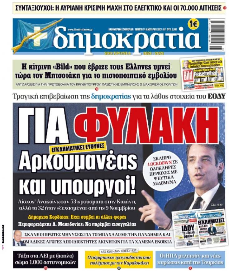 Η εφημερίδα στο σημερινό της πρωτοσέλιδο αναφέρει πως ο ΕΟΔΥ ανακοίνωσε 53 κρούσματα κορονοϊού στην Κοζάνη και κατηγορεί τον Οργανισμός πως τα 32 από αυτά ήταν από τις 9 Νοεμβρίου.