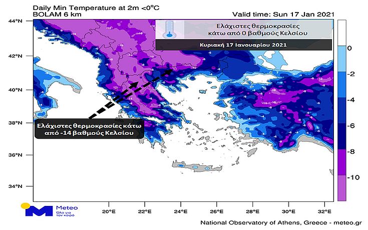 Οι ιδιαίτερα ψυχρές αέριες μάζες που συνοδεύουν την κακοκαιρία «Λέανδρος» σε συνδυασμό με τις περιορισμένες νεφώσεις κατά τη διάρκεια της νύχτας, έριξαν την ελάχιστη θερμοκρασία κάτω από τους μηδέν βαθμούς Κελσίου στο σύνολο σχεδόν της ηπειρωτικής χώρας. Ιδιαίτερα στα βόρεια ο υδράργυρος έπεσε κατά τόπους κάτω από τους -14 βαθμούς Κελσίου. Στο χάρτη που ακολουθεί παρουσιάζεται η ελάχιστη θερμοκρασία που αναμένεται την Κυριακή 17/1