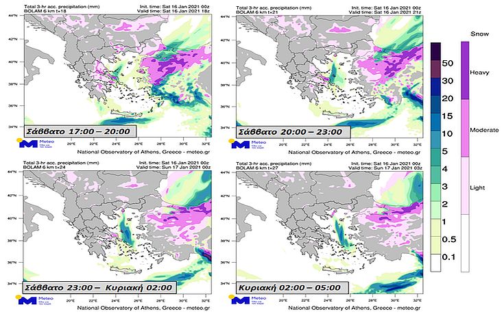 Στους χάρτες που ακολουθούν παρουσιάζεται ο ολικός υετός (βροχή/χιόνι) που αναμένεται από το απόγευμα του Σαββάτου 16/1 έως το πρωί της Κυριακής 17/1.