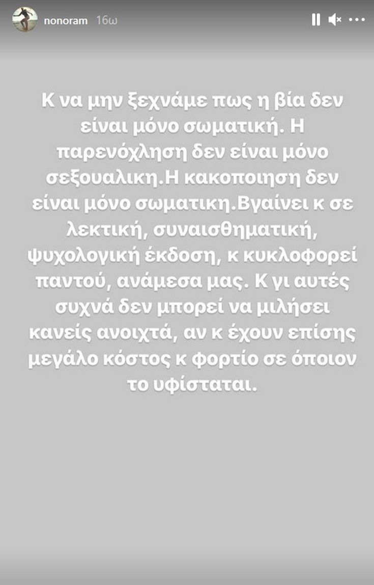 Η Ελεωνόρα Μελέτη, με ένα insta story στο Instagram, τόνισε ότι δεν πρέπει να ξεχνάμε ότι η βία δεν είναι μόνο σωματική, επισημαίνοντας ότι και η λεκτική και συναισθηματική βία έχει πολύ κόστος για όποιον την υφίσταται.