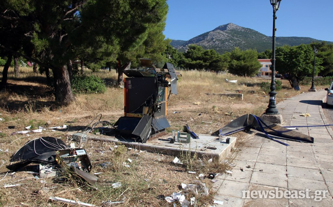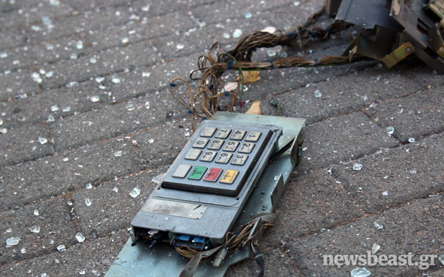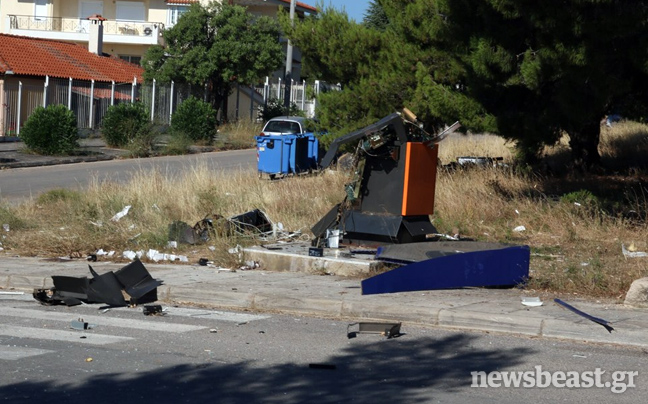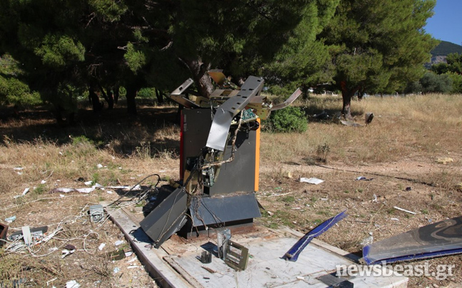 Όπως βλέπετε από τις φωτογραφίες του newsbeast.gr, το μηχάνημα αναλήψεως χρημάτων καταστράφηκε ολοσχερώς και την ίδια στιγμή, από την ισχυρή έκρηξη, εκτοξεύθηκε τουλάχιστον 20 μέτρα μακριά από το σημείο της έκρηξης.