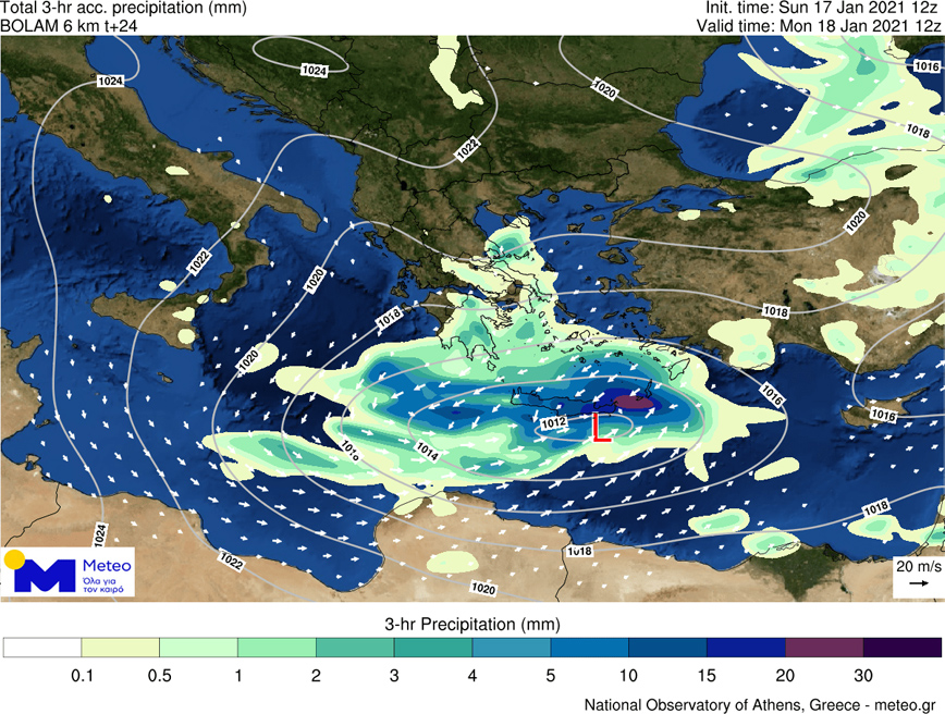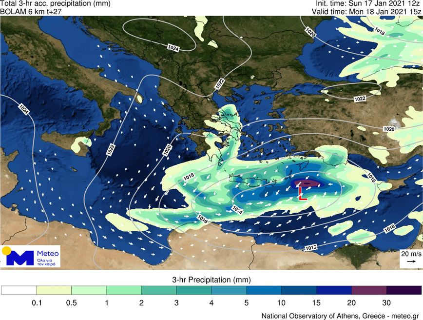 Στους προγνωστικούς χάρτες που ακολουθούν φαίνεται η θέση του βαρομετρικού χαμηλού και τα φαινόμενα που αναμένεται να το συνοδεύσουν (βροχοπτώσεις/χιονοπτώσεις) κατά τα τρίωρα 11:00-14:00 και 14:00-17:00 της Δευτέρας 18/01.