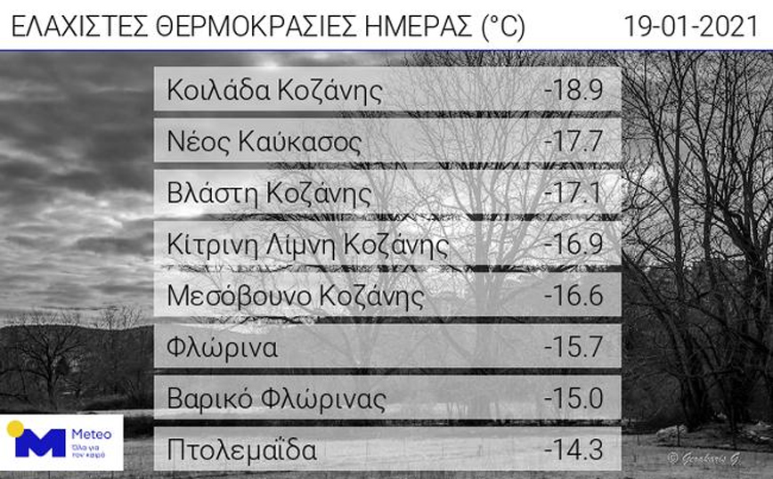 Σύμφωνα με το δίκτυο αυτόματων μετεωρολογικών σταθμών του Εθνικού Αστεροσκοπείου Αθηνών/meteo.gr, πολικές θερμοκρασίες επικράτησαν νωρίς το πρωί της Τρίτης 19/01 στη Μακεδονία, με τη χαμηλότερη θερμοκρασία να καταγράφεται στην Κοιλάδα Κοζάνης με -18,9 C.