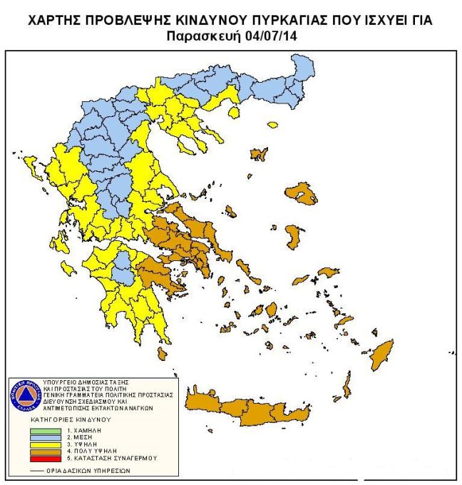 Πολύ υψηλός είναι σήμερα ο κίνδυνος για πυρκαγιά (κατηγορία κινδύνου 4) σύμφωνα με το Χάρτη Πρόβλεψης Κινδύνου Πυρκαγιάς που εκδίδει η Γενική Γραμματεία Πολιτικής Προστασίας του υπουργείου Δημόσιας Τάξης.