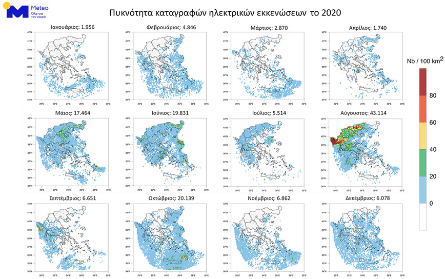 Ο Χάρτης 1 δείχνει την πυκνότητα των ηλεκτρικών εκκενώσεων που κατέγραψε το σύστημα ανίχνευσης του Εθνικού Αστεροσκοπείου Αθηνών/meteo.gr ZEUS το 2020, η συντριπτική πλειοψηφία των οποίων αφορά κεραυνούς και ένα μικρό ποσοστό αστραπών.