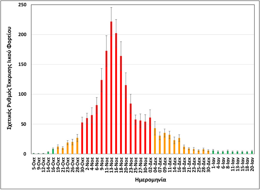 Σημειώνεται ότι οι ημέρες των δειγματοληψιών που καταγράφονται με κόκκινο χρώμα αντιστοιχούν σε περισσότερα από 500 κρούσματα – όπως ανακοινώθηκαν τις αντίστοιχες ημέρες από τον ΕΟΔΥ – οι μέρες που καταγράφονται με πορτοκαλί σε 100-400 κρούσματα και οι μέρες που καταγράφονται με πράσινο σε λιγότερα από εκατό κρούσματα.