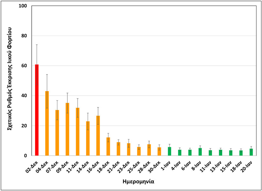 Στις δύο συνημμένες φωτογραφίες του διαγράμματος που δημοσιεύει το ΑΠΕ-ΜΠΕ αποτυπώνονται οι κλίμακες έκκρισης ιικού φορτίου: Στην πρώτη φαίνονται σε μεγαλύτερο εύρος χρόνου –από τις 2 Οκτωβρίου 2020 έως και την τελευταία μέτρηση της 20ης Ιανουαρίου για την οποία σήμερα ολοκληρώθηκε ο περιβαλλοντικός εξορθολογισμός, ενώ στη δεύτερη μπορούν να διακριθούν ξεκάθαρα οι μικρές στα όρια του σφάλματος αυξομειώσεις του ιικού φορτίου από την 1η Ιανουαρίου, σταθερά σε χαμηλά επίπεδα.