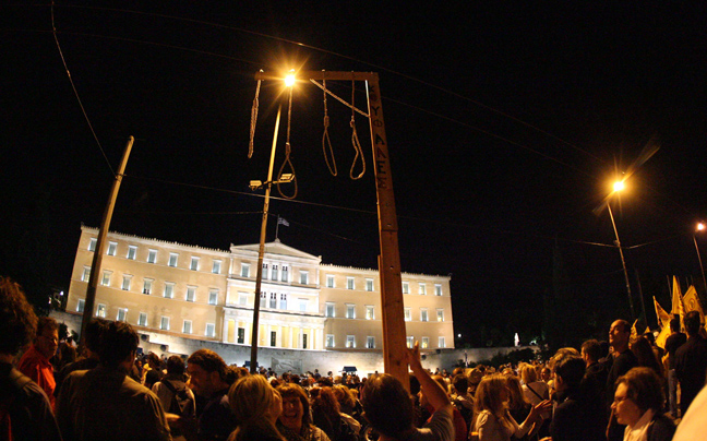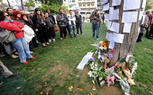 Tέλος στη ζωή του βάζει λίγο μετά τις 9 το πρωί της Τετάρτης 04 Απριλίου 2012 ένας ηλικιωμένος άνδρας μπροστά στα μάτια εμβρόντητων περαστικών στην πλατεία Συντάγματος. Χωρίς κανείς να καταλάβει το παραμικρό ή να προλάβει να παρέμβει, ο αυτόχειρας έβγαλε όπλο και αυτοπυροβολήθηκε στο κεφάλι. Στο σημείωμα που άφησε ανέφερε τα εξής: «Η κατοχική κυβέρνηση Τσολάκογλου εκμηδένισε κυριολεκτικά την δυνατότητα επιβίωσής μου που στηριζόταν σε μία αξιοπρεπή σύνταξη που επί 35 χρόνια εγώ μόνον (χωρίς ενίσχυση κράτους) πλήρωνα γι’ αυτή. Επειδή έχω μία ηλικία που δεν μου δίνει την ατομική δυνατότητα δυναμικής αντίδρασης (χωρίς βέβαια να αποκλείω ότι αν ένας Έλληνας έπαιρνε το καλάσνικοφ ο δεύτερος θα ήμουν εγώ) δεν βρίσκω άλλη λύση από ένα αξιοπρεπές τέλος πριν αρχίσω να ψάχνω στα σκουπίδια για την διατροφή μου. Πιστεύω πως οι νέοι χωρίς μέλλον, κάποια μέρα θα πάρουν τα όπλα και στην πλατεία Συντάγματος θα κρεμάσουν ανάποδα τους εθνικούς προδότες όπως έκαναν το 1945 οι Ιταλοί στον Μουσολίνι (πιάτσα Λορέτο του Μιλάνου)».