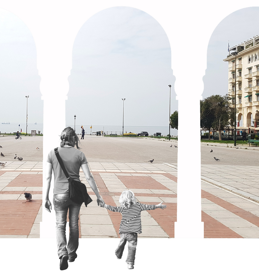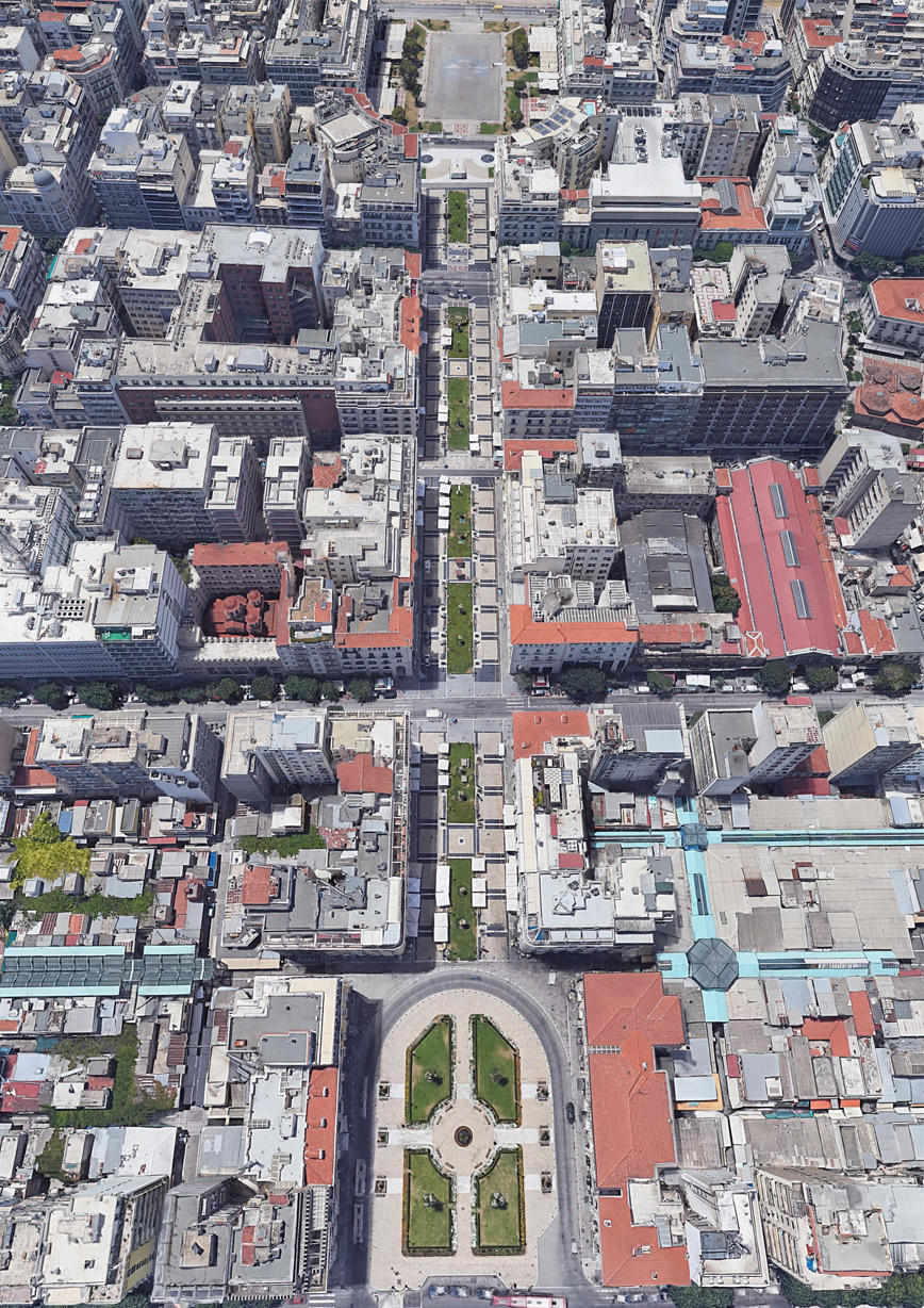 - Η λειτουργική και αισθητική διασύνδεση του δημόσιου χώρου του άξονα με τις ισόγειες στοές των κτιρίων που τον περιβάλλουν.