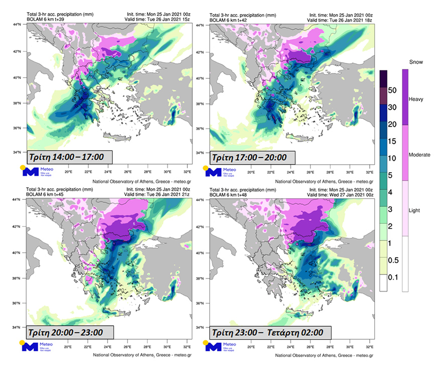 Τα φαινόμενα θα είναι κατά τόπους ισχυρά από το μεσημέρι της Τρίτης έως τις πρώτες ώρες της Τετάρτης. Ιδιαίτερα στη Θράκη αναμένονται ισχυρές χιονοπτώσεις από το βράδυ της Τρίτης. Παράλληλα, χιονοπτώσεις θα σημειωθούν κατά τόπους ακόμη και σε πεδινές περιοχές της Μακεδονίας από το μεσημέρι της Τρίτης.