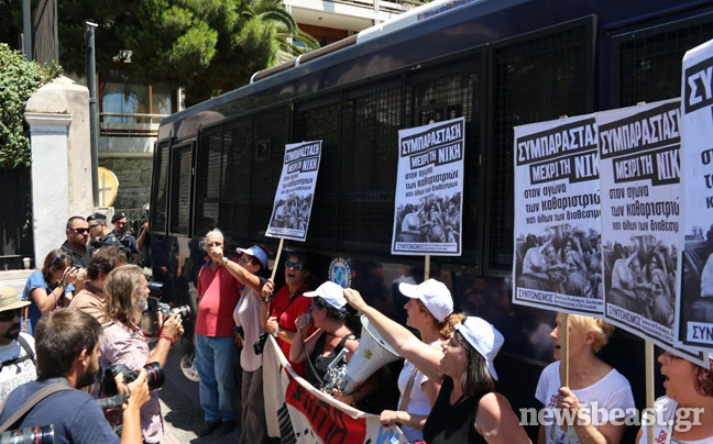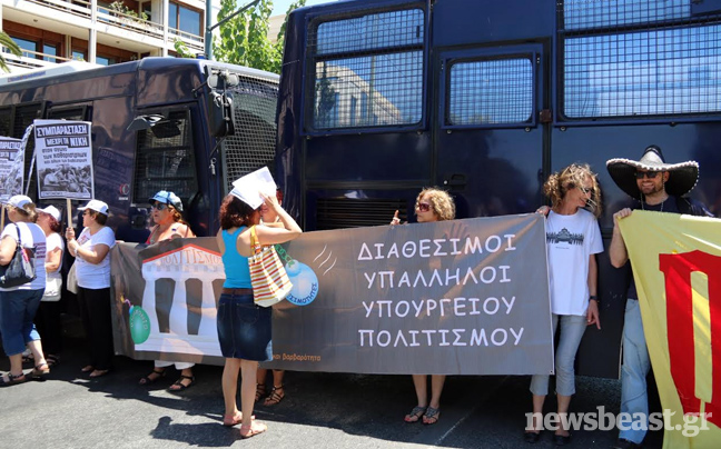 Μπροστά από το υπουργείο είχαν τοποθετηθεί δυνάμεις των ΜΑΤ. Οι συγκεντρωμένοι που εργάζονται στο υπουργείο Πολιτισμού έκαναν λογοπαίγνιο γράφοντας στα πανό: ««Πωλειτισμός».