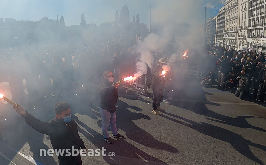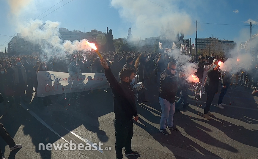 Λίγα μετά τις 2 το μεσημέρι, οι συμμετέχοντες στο συλλαλητήριο άναψαν καπνογόνα στο Σύνταγμα, μπροστά από την Βουλή, με τους φοιτητές και τους μαθητές να σχηματίζουν μεταξύ τους μια ανθρώπινη αλυσίδα.