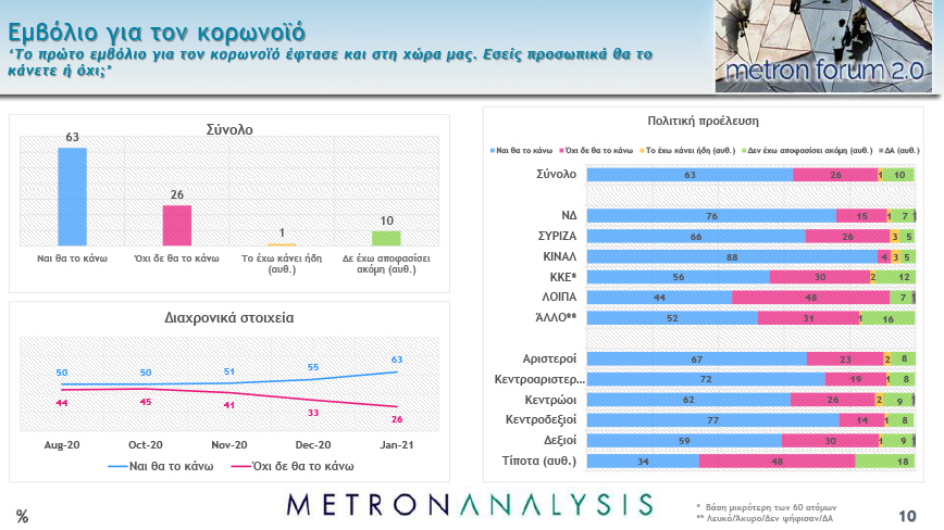 Σε ότι αφορά το εμβόλιο του κορονοϊού, το μεγαλύτερο ποσοστό είναι αποφασισμένο να το κάνει. Συγκεκριμένα το 63% των ερωτηθέντων απάντησε θετικά στην ερώτηση αν θα κάνει το εμβόλιο σε αντίθεση με το 26% που απάντησε αρνητικά. Το ποσοστό των αναποφάσιστων ανέρχεται σε 10%.