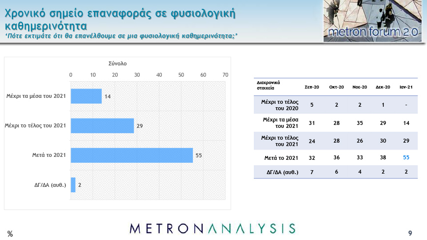 Το 55% των ερωτηθέντων στη δημοσκόπηση της MetronAnalysis για λογαριασμό του κεντρικού δελτίου ειδήσεων του Mega σε δείγμα 1.200 ατόμων απάντησε πως πιστεύει η κοινότητα θα επιστρέψει στην κανονικότητα μετά το 2021. Το 29% απάντησε πως θα επιστρέψουμε μέχρι το τέλος του 2021 και το 14% των ερωτηθέντων πιστεύει πως η επιστροφή στην κανονικότητα θα γίνει μέχρι τα μέσα του 2021.