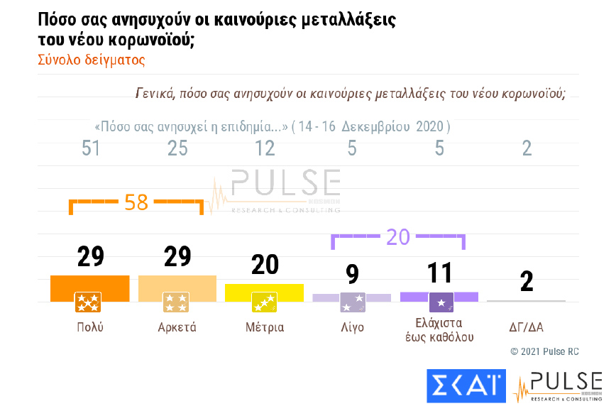 Σύμφωνα με τη δημοσκόπηση της εταιρείας Pulse η οποία πραγματοποιήθηκε για λογαριασμό του κεντρικού δελτίου ειδήσεων του ΣΚΑΪ σε δείγμα 1.506 πολιτών και προβλήθηκε το βράδυ της Πέμπτης, οι πολίτες σε ποσοστό 58% ανησυχούν πολύ.