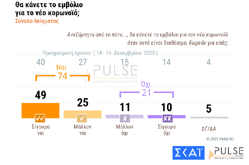 Σε ότι αφορά το εμβόλιο του κορονοϊού, το 74% των πολιτών απάντησαν θετικά σε ερώτηση αν θα το κάνουν σε αντίθεση με το 21% που απάντησε αρνητικά.