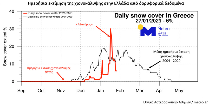Αρκετά χαμηλότερο σε σχέση με τον μέσο όρο των προηγούμενων ετών είναι το ποσοστό της χερσαίας έκτασης της Ελλάδας που καλύπτεται από το χιόνι. Συγκεκριμένα, κυμαίνεται περίπου στο 6%, αρκετά μακριά από όσο ανερχόταν το διάστημα 2004-20.