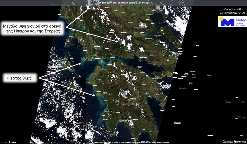 Αυτό προκύπτει από τις εικόνες στις 28 Ιανουαρίου που έστειλε ο ευρωπαϊκός δορυφόρος Sentinel-2, ο οποίος κατέγραψε ένα μεγάλο μέρος της χώρας μας στο ορατό φάσμα και σε πολύ υψηλή ανάλυση (10 μ).