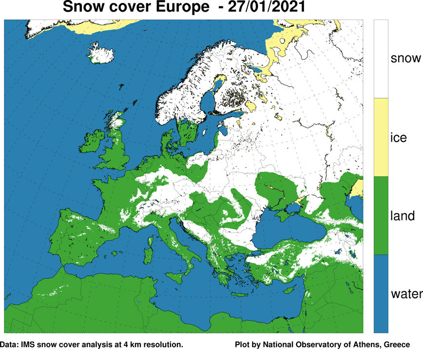 Η χιονοκάλυψη, σύμφωνα με τις δορυφορικές παρατηρήσεις, είναι επίσης περιορισμένη στα Βόρεια Βαλκάνια, στην Κεντρική και Νότια Ιταλία και στην Ουκρανία. Αντίθετα, στην Κεντρική και Βόρεια Ευρώπη η έκταση της χιονοκάλυψης είναι σε φυσιολογικά για την εποχή επίπεδα.