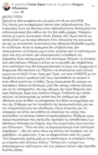 Σε ανάρτησή του στο Facebook ο σκηνοθέτης υποστηρίζει ότι «δεν απαγορεύεται να ζητήσεις γυμνό όταν ορίζεται από το καλλιτεχνικό έργο», ξεκαθαρίζοντας όμως ότι «αυτά τα πράγματα δεν επιβάλλονται».