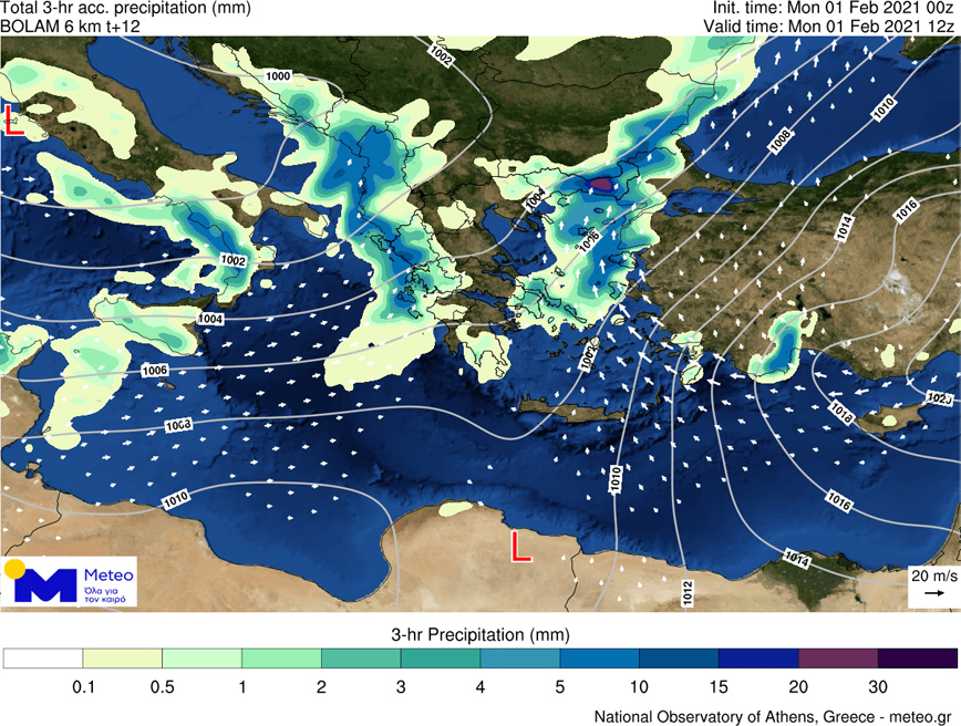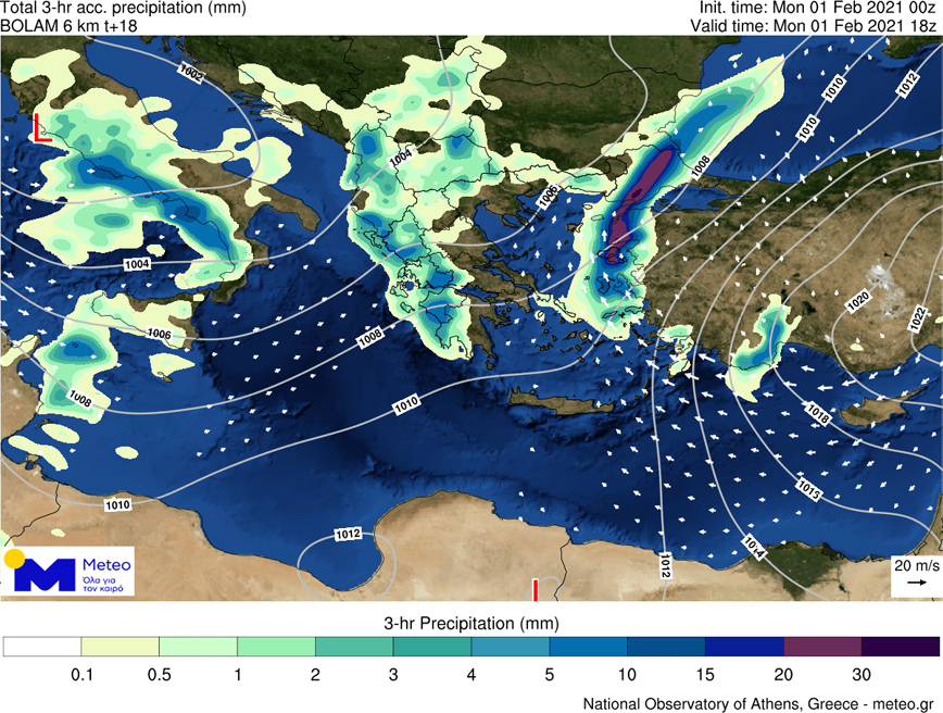 Στους προγνωστικούς χάρτες που ακολουθούν αποτυπώνονται οι περιοχές όπου αναμένονται τα σημαντικότερα φαινόμενα κατά τα τρίωρα 11:00-14:00 και 17:00-20:00 της Δευτέρας 01/02.