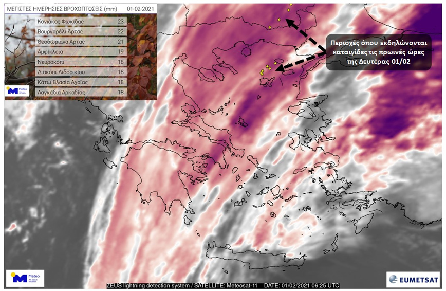 Βροχοπτώσεις εκδηλώνονται τις πρωινές ώρες της Δευτέρας 1 Φεβρουαρίου σε αρκετές περιοχές της χώρας, οι οποίες στα βορειοανατολικά τμήματα συνοδεύονται από καταιγίδες.