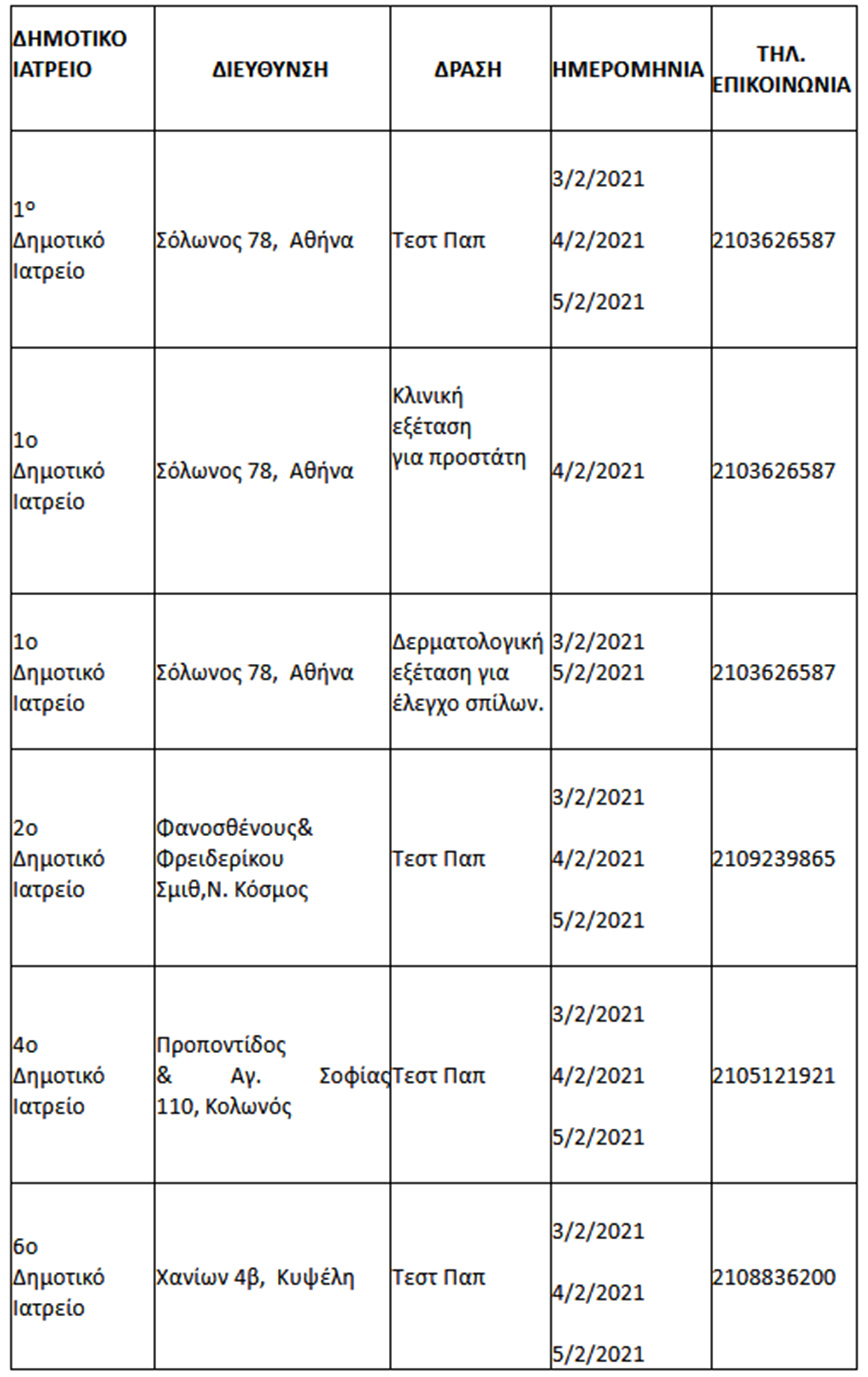 Από την Τετάρτη 3 Φεβρουαρίου έως και την Παρασκευή 5 Φεβρουαρίου, στα δημοτικά ιατρεία της πρωτεύουσας θα πραγματοποιείται δωρεάν προληπτικός έλεγχος σε όσους πολίτες το επιθυμούν.