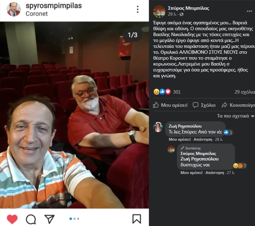 «Έφυγε ακόμα ένας αγαπημένος μου… Βαριά θλίψη και οδύνη. Ο σπουδαίος μας σκηνοθέτης Βασίλης Νικολαΐδης με τις τόσες επιτυχίες και το μεγάλο έργο έφυγε από κοντά μας…Η τελευταία του παράσταση ήταν μαζί μας πέρυσι το. Θρυλικό ΑΛΛΟΙΜΟΝΟ ΣΤΟΥΣ ΝΕΟΥΣ στο θέατρο Κορονετ που το σταμάτησε ο κορωνοιος..Λατρεμένε μου Βασίλη σ ευχαριστούμε για όσα μας προσέφερες, ήθος και γνώση» έγραψε ο Σπύρος Μπιμπίλας στην ανάρτηση του.