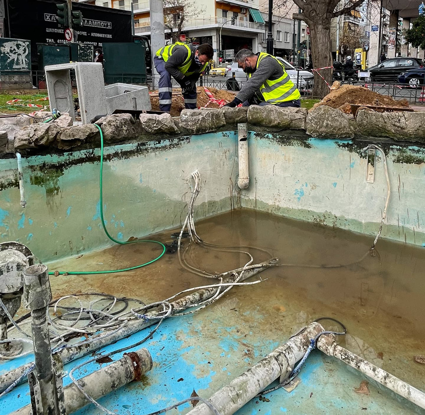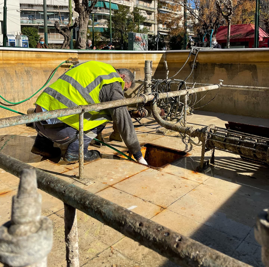 Μικτά κλιμάκια εξειδικευμένων τεχνιτών πραγματοποιούν εργασίες καθαρισμού, επισκευής και αποκατάστασης στα δεκάδες σιντριβάνια της πόλης, με επισκευές στα συστήματα αποχέτευσης και ηλεκτροφωτισμού, οικοδομικές εργασίες, στεγανοποιήσεις, αποκαταστάσεις μαρμάρινων ποδιών και γενικά του εκσυγχρονισμού τους και της αποκατάστασης της λειτουργικότητάς τους.