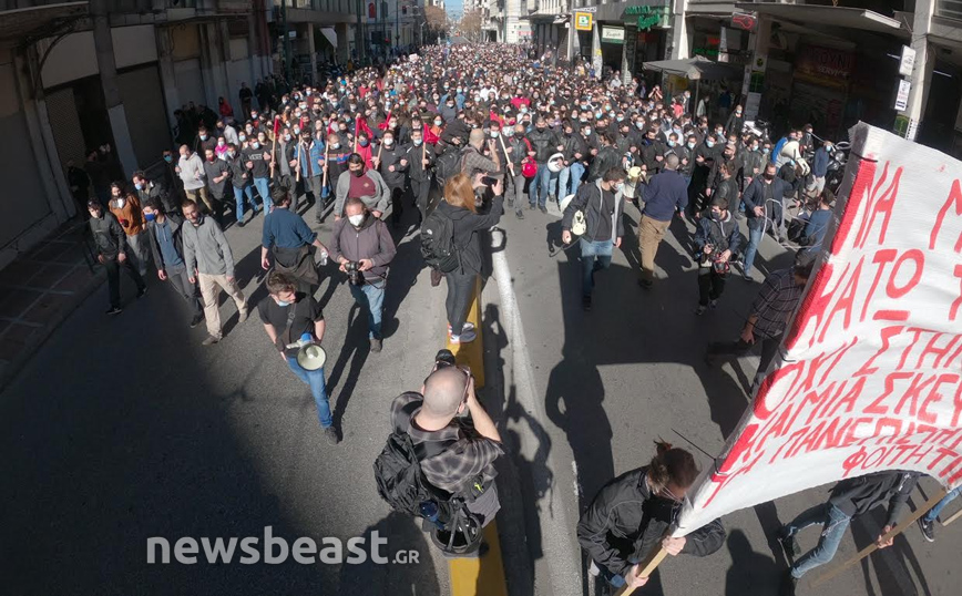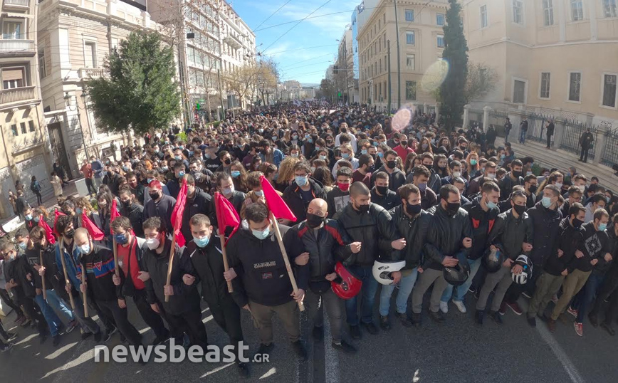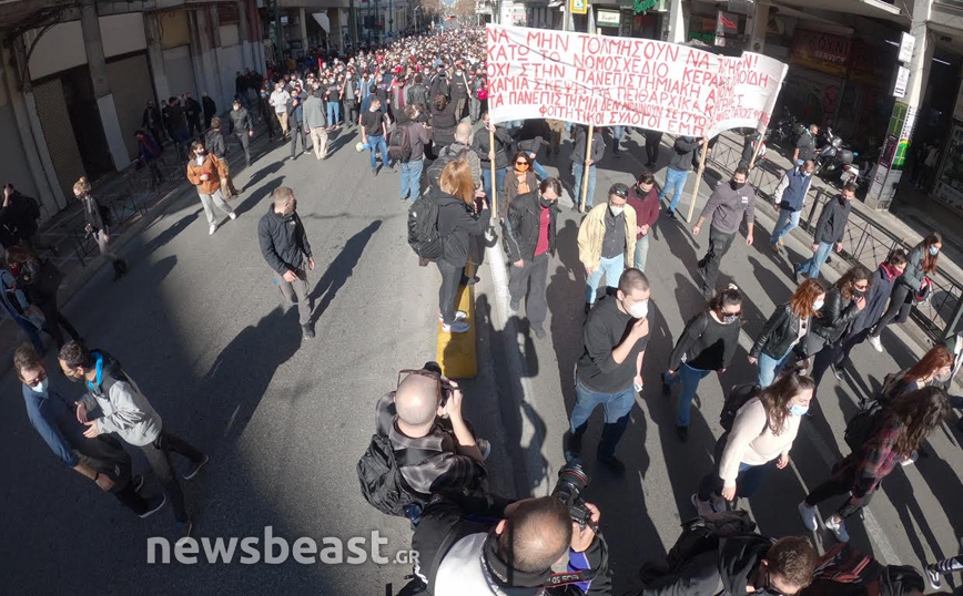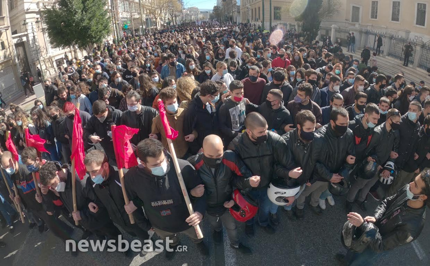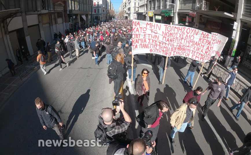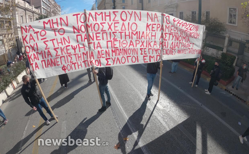 Οι διαδηλωτές και οι διαδηλώτριες με κεντρικό σύνθημα «Όχι στο νομοσχέδιο Κεραμέως, καμία σκέψη για πανεπιστημιακή αστυνομία- διαγραφές πειθαρχικά», συγκεντρώθηκαν αρχικά στα Προπύλαια και πρόκειται να κατευθυνθούν μέχρι τη Βουλή.