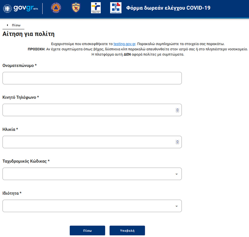 Σημειώνεται ότι η πλατφόρμα αυτή ΔΕΝ αφορά πολίτες με συμπτώματα.