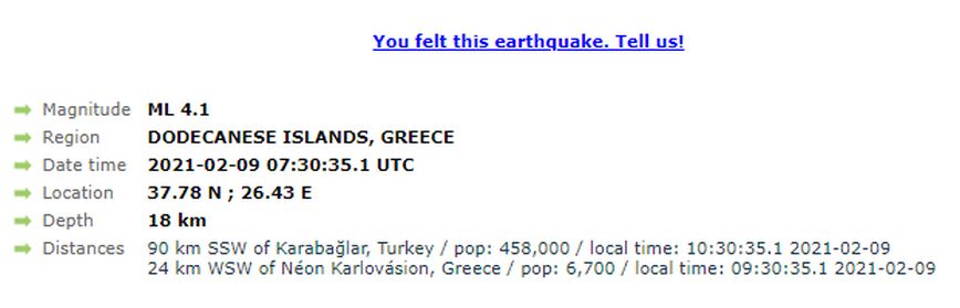 Επίσης, όπως ανακοινώθηκε από το Γεωδυναμικό Ινστιτούτο του Εθνικού Αστεροσκοπείου Αθηνών, ο σεισμός υπολογίστηκε -επίσης- στα 4,1 Ρίχτερ, σε απόσταση 239 χιλιόμετρα ανατολικά της Αθήνας και το επίκεντρο της δόνησης εντοπίζεται στον θαλάσσιο χώρο 32 χιλιόμετρα βορειοανατολικά της Ικαρίας.
