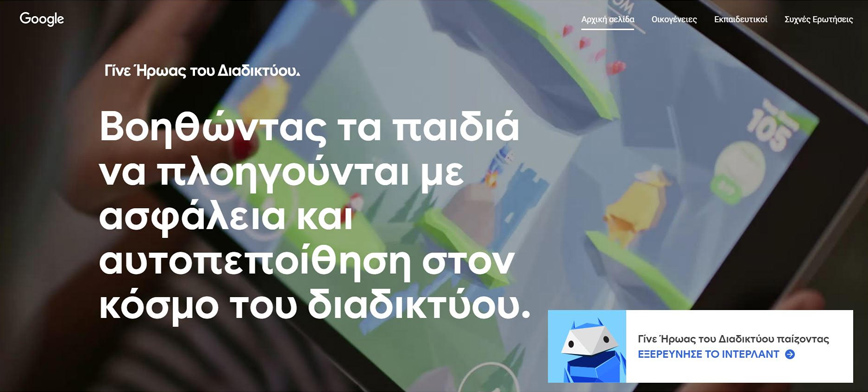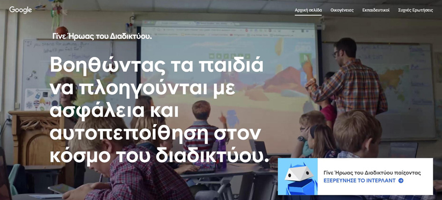 O κύκλος μαθημάτων «Γίνε Ήρωας του Διαδικτύου», είναι ένα πολύπλευρο πρόγραμμα που παρέχει στους εκπαιδευτικούς τα εργαλεία και τις μεθόδους που χρειάζονται για να διδάξουν τις βασικές αρχές ψηφιακής ασφάλειας και ψηφιακής ιθαγένειας στο περιβάλλον της σχολικής τάξης. Τα μαθήματα διεξάγονται από το Ινστιτούτο Πληροφορικής του Ιδρύματος Τεχνολογίας και Έρευνας και πλαισιώνονται από τεχνικές «παιχνιδοποίησης» (gamification) με τη βοήθεια του Interland (g.co/Interland), ενός διαδικτυακού παιχνιδιού περιπέτειας που καθιστά τη μάθηση σχετικά με την ψηφιακή ασφάλεια και την ψηφιακή ιθαγένεια, διαδραστική και διασκεδαστική – όπως είναι και το ίδιο το Διαδίκτυο.