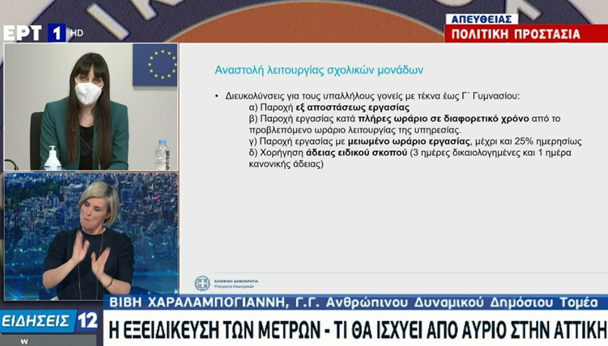 Ακόμη η γγ Ανθρώπινου Δυναμικού Δημόσιου Τομέα αναφέρθηκε και στις διευκολύνσεις για γονείς με παιδιά έως τη Γ’ Γυμνασίου με την παροχή μεταξύ άλλων εξ αποστάσεων εργασίας, μειωμένο ωράριο έως 25% ημερησίως και τη χορήγηση άδειας ειδικού σκοπού.