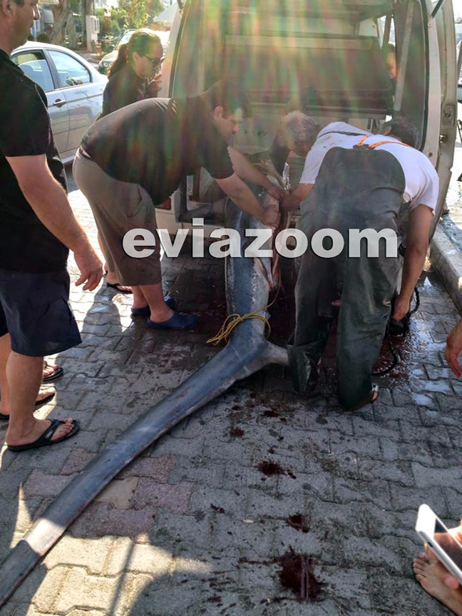 Δεν πίστευαν στα μάτια τους οι ψαράδες στο Κάραβο Αλιβερίου, όταν είδαν ότι η ψαριά τους αποτελείτο από ένα τεράστιο σκυλόψαρο μήκους 3,5 μέτρων.