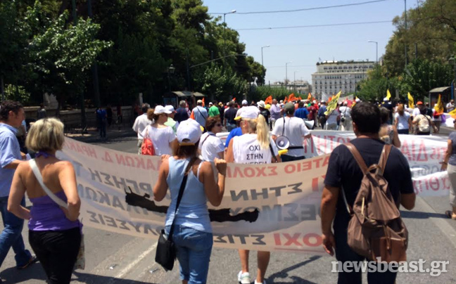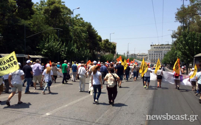 Οι υπάλληλοι του Δημοσίου που έχουν τεθεί σε διαθεσιμότητα διαδήλωσαν και τώρα πηγαίνουν προς τις απολυμένες καθαρίστριες του ΥΠΟΙΚ σε ένδειξη συμπαράστασης.