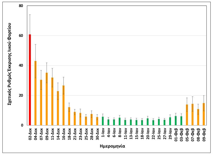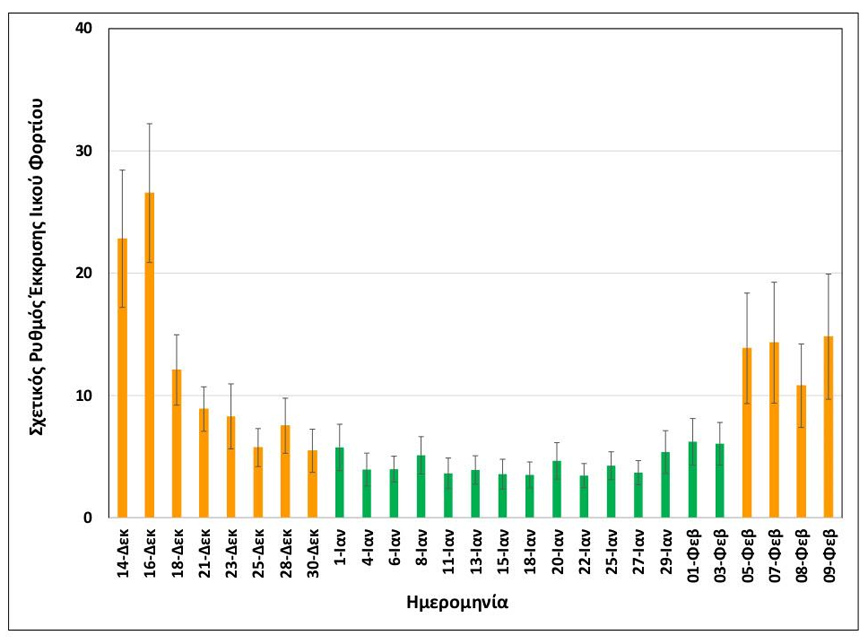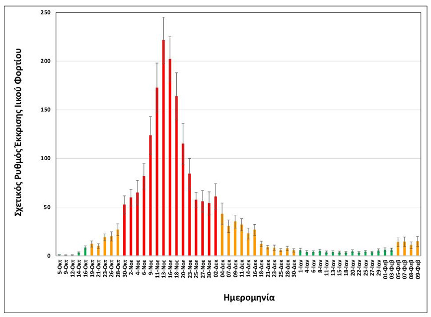 Στα διαγράμματα, οι ημέρες των δειγματοληψιών που καταγράφονται με κόκκινο χρώμα αντιστοιχούν σε περισσότερα από 500 κρούσματα – όπως ανακοινώθηκαν τις αντίστοιχες ημέρες από τον ΕΟΔΥ – οι μέρες που καταγράφονται με πορτοκαλί σε 100-400 κρούσματα και οι μέρες που καταγράφονται με πράσινο σε λιγότερα από εκατό κρούσματα.