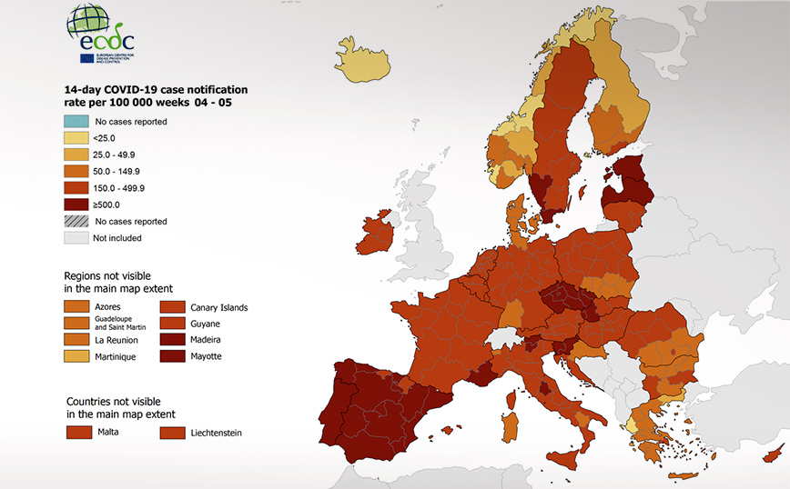 Τους αναθεωρημένους χάρτες που αποτυπώνουν την επιδημιολογική εικόνα της πανδημίας του κορονοϊού στα κράτη-μέλη της ΕΕ δημοσίευσε το Eυρωπαϊκό Κέντρο Πρόληψης και Ελέγχου Νόσων (ECDC).
