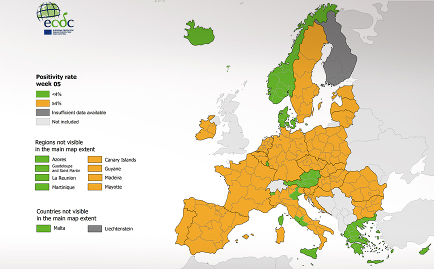 Αναφορικά με τον δείκτη θετικότητας η χώρα μας βρίσκεται στο μεγαλύτερο μέρος στο «πράσινο» και αυτό σημαίνει πως ο δείκτης κυμαίνεται κάτω από το 4%, που είναι και το ευρωπαϊκό όριο.