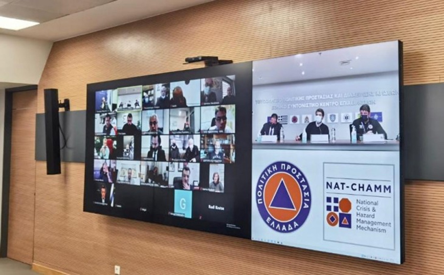 Ολοκληρώθηκε η ευρεία σύσκεψη υπό τον Υπουργό Προστασίας του Πολίτη, Μιχάλη Χρυσοχοΐδη και τον Υφυπουργό Πολιτικής Προστασίας και Διαχείρισης Κρίσεων, Νίκο Χαρδαλιά, παρουσία του Αναπληρωτή Υπουργού Εσωτερικών αρμόδιου για θέματα Αυτοδιοίκησης, Στέλιου Πέτσα, του Υφυπουργού παρά τω Πρωθυπουργώ στον Υπουργό Επικρατείας, Θεόδωρου Λιβάνιου και του Κυβερνητικού Εκπροσώπου, Χρήστου Ταραντίλη, που πραγματοποιήθηκε σήμερα στο Κέντρο Επιχειρήσεων της Πολιτικής Προστασίας (κτίριο Φάρος).