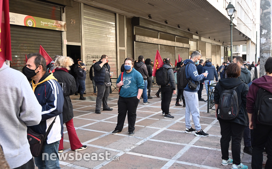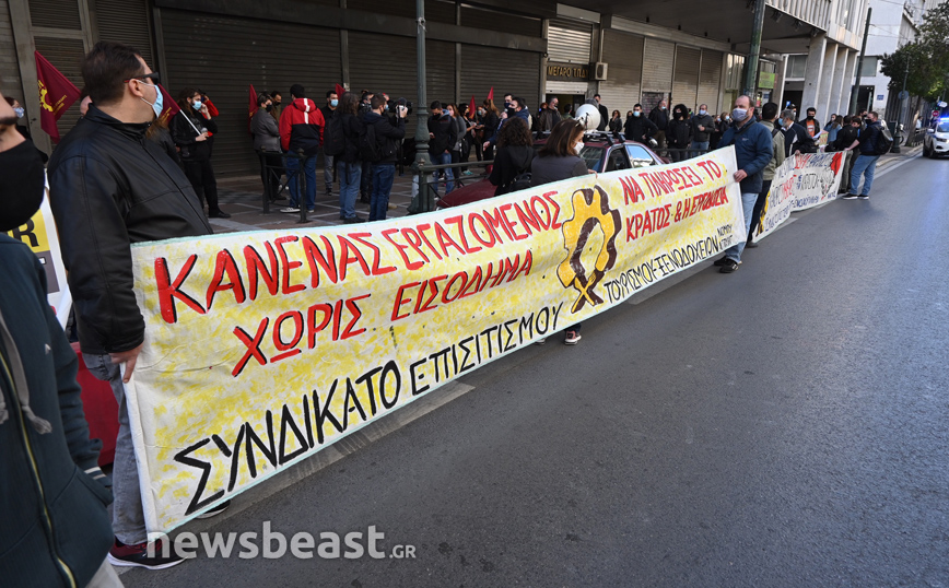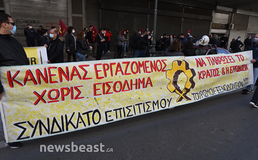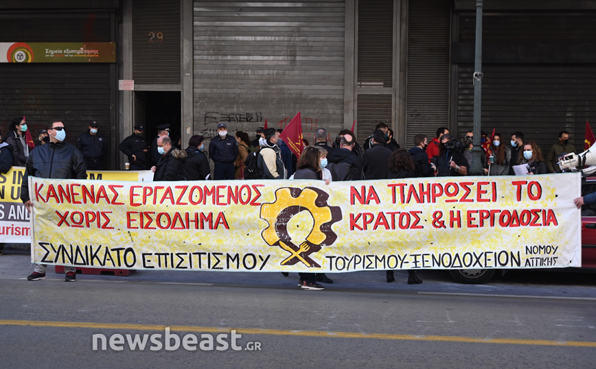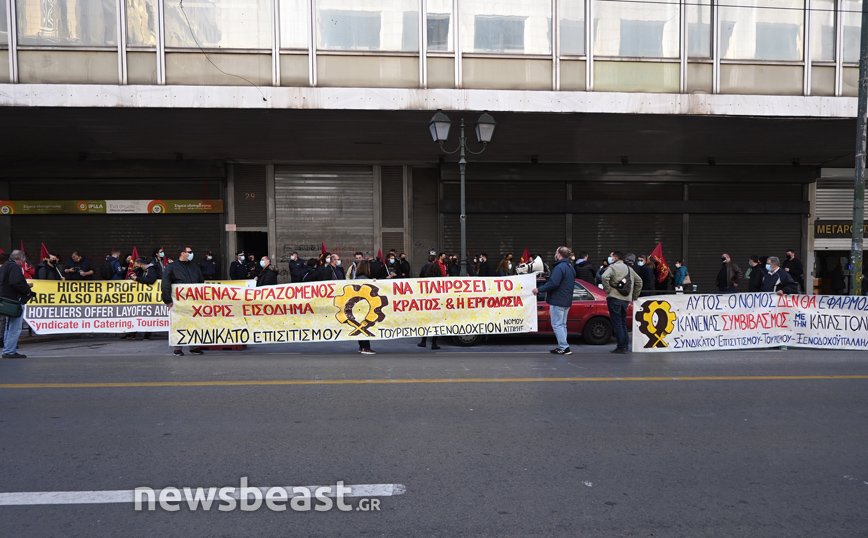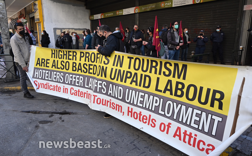 Νωρίτερα και συγκεκριμένα στις 12 το μεσημέρι μέλη του Συνδικάτου Επισιτισμού Τουρισμού Ξενοδοχοϋπαλλήλων Ν. Αττικής πραγματοποίησαν συγκέντρωση έξω από το υπουργείο Εργασίας. Μάλιστα αντιπροσωπεία τους συναντήθηκε με τον διευθυντή του υπουργείου αλλά η συνάντησή μαζί του ήταν άκαρπη.