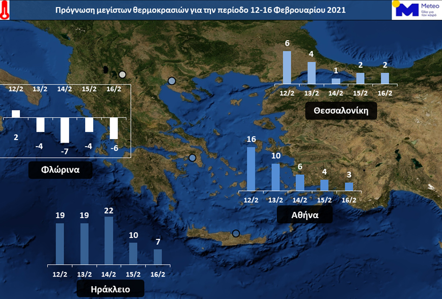 Η πτωτική πορεία της θερμοκρασίας τις επόμενες ημέρες σε τέσσερις πόλεις της χώρας μας, παρουσιάζεται στο Σχήμα 3. Ενδεικτικά αναφέρεται ότι στην πόλη της Αθήνας, η θερμοκρασία την Τρίτη 16/02 δεν θα ξεπεράσει τους 3 βαθμούς, σημειώνοντας μια πτώση της τάξης των 13 βαθμών συγκριτικά με τη θερμοκρασία της Παρασκευής 12/02, ενώ στη Φλώρινα από το Σάββατο 13/02 έως την Τρίτη 16/02 θα επικρατήσουν συνθήκες ολικού παγετού.