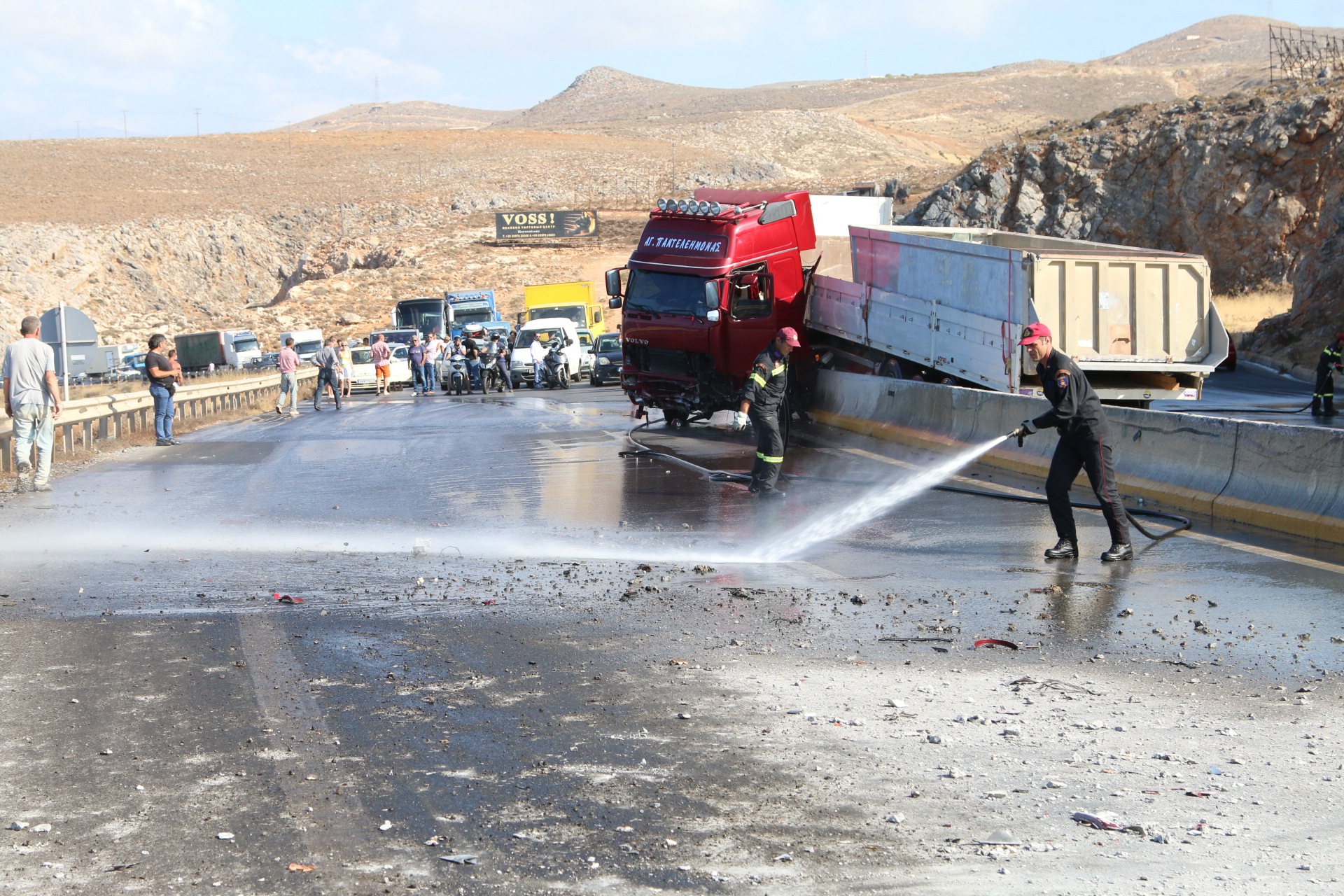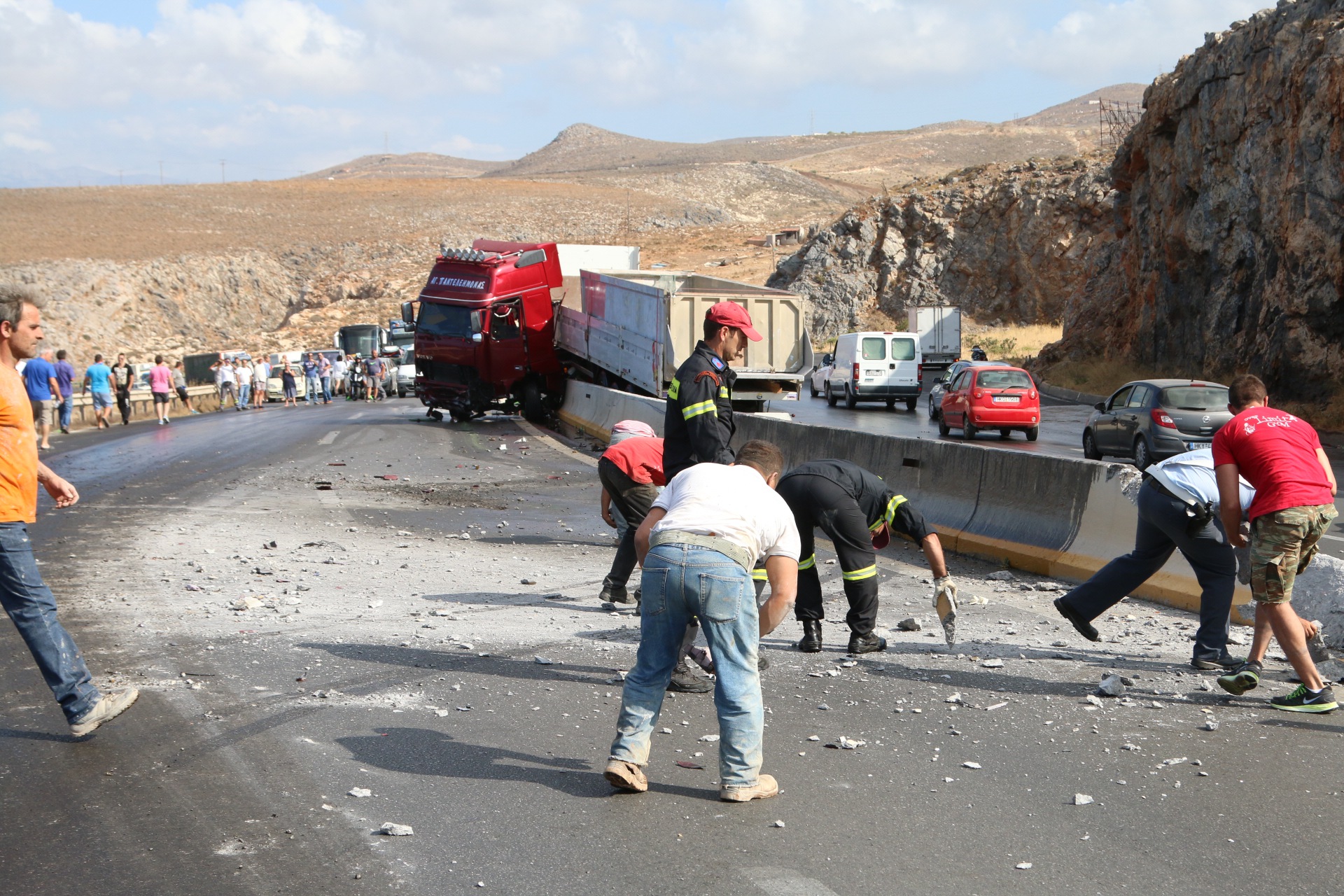 Σύμφωνα με το cretapost.gr, όλα ξεκίνησαν όταν έσκασε το μπροστινό λάστιχο της νταλίκας με τον οδηγό να χάνει τον έλεγχο του οχήματος και να ντελαπάρει. Όπως φαίνονται και στις εικόνες το αποτέλεσμα ήταν η νταλίκα να περάσει πάνω από το διαχωριστικό στηθαίο, να το σπάσει και να βρεθεί στο αντίθετο ρεύμα με την καρότσα του να στέκεται στο άλλο ρεύμα.