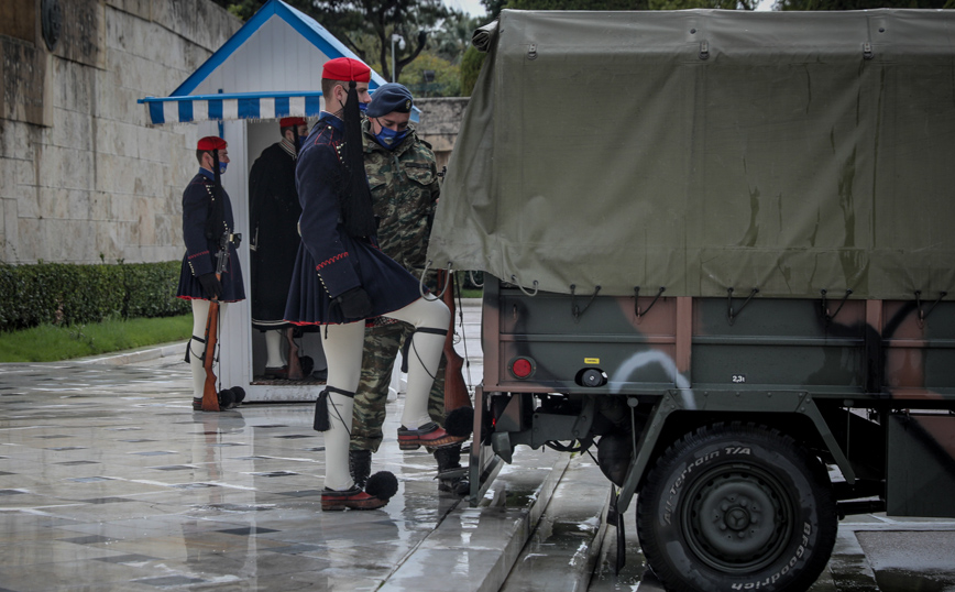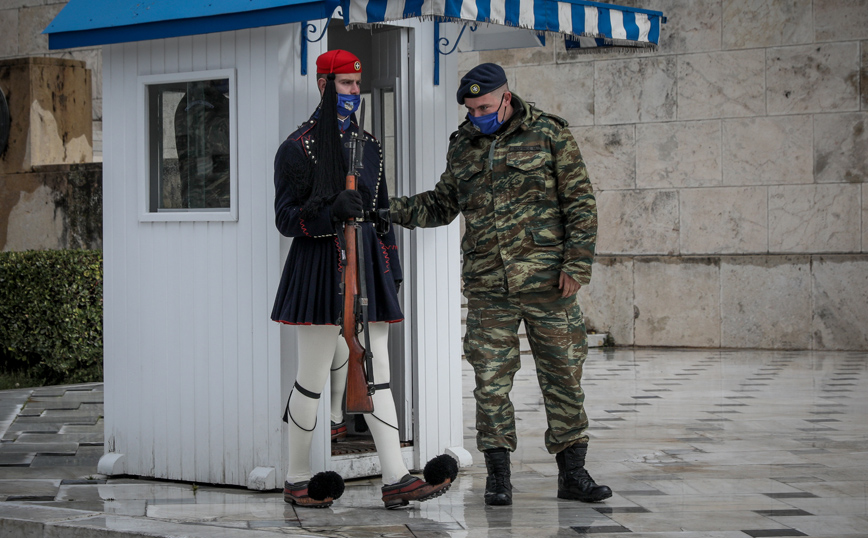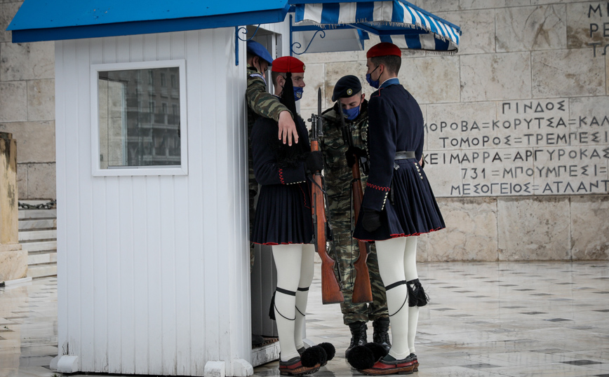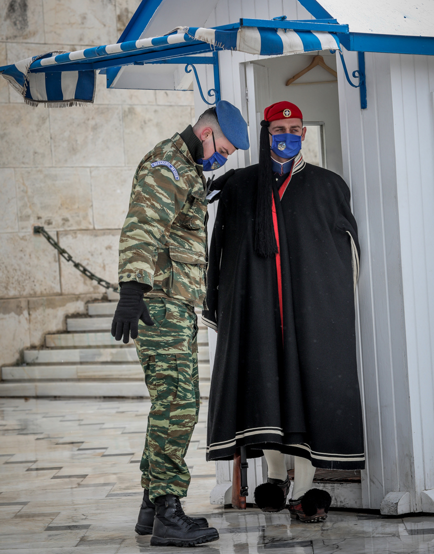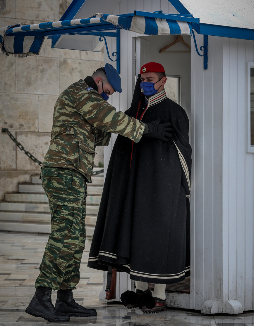 Οι Εύζωνες στο Μνημείο του Άγνωστου Στρατιώτη, που στέκονται ακίνητοι, φόρεσαν σήμερα λόγω του κρύου τις μπλε σκούρες τσόχινες κάπες τους. Μάλιστα η αλλαγή φρουράς έγινε παρουσία στρατιωτικού οχήματος καθώς το οδόστρωμα γλιστρούσε.
